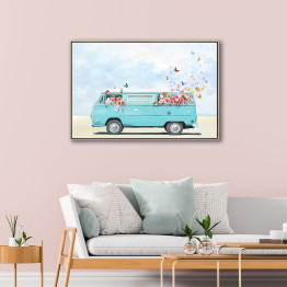 Plongez dans une atmosphère joyeuse et vintage avec cette toile artistique représentant un combi rétro bleu clair, vu de profil, dans un décor estival enchanteur.