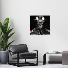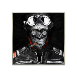 Ce tableau représente un singe motard charismatique, vêtu d’une veste en cuir, un cigare à la bouche et des lunettes sur la tête.